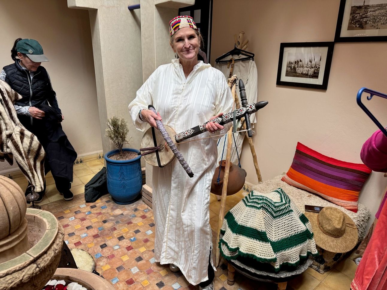 Jeannie Ralston is having such a good time in Morocco this week. As always, she’s diving deep into the experience. Trying on traditional clothing, feeling the vibe of a a local Berber instrument..
