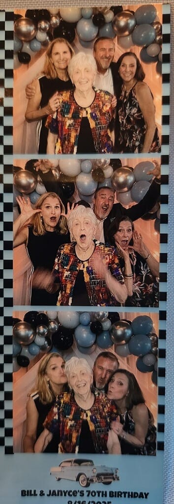 This is birthday party week for Jeannie Ralston, who attended her sister and brother-in-law’s 70th celebration this weekend. It was a wonderful affair—the highlight being their 4 children singing their version of “If I Had a Million Dollars,” by the Bare Naked Ladies—a family favorite. Also, the photo booth was a hoot. Below is a photo strip of me with 2 of my 5 siblings and my 96-year-old mom, who stayed later than many of those in their early 70s. Go mom go!!