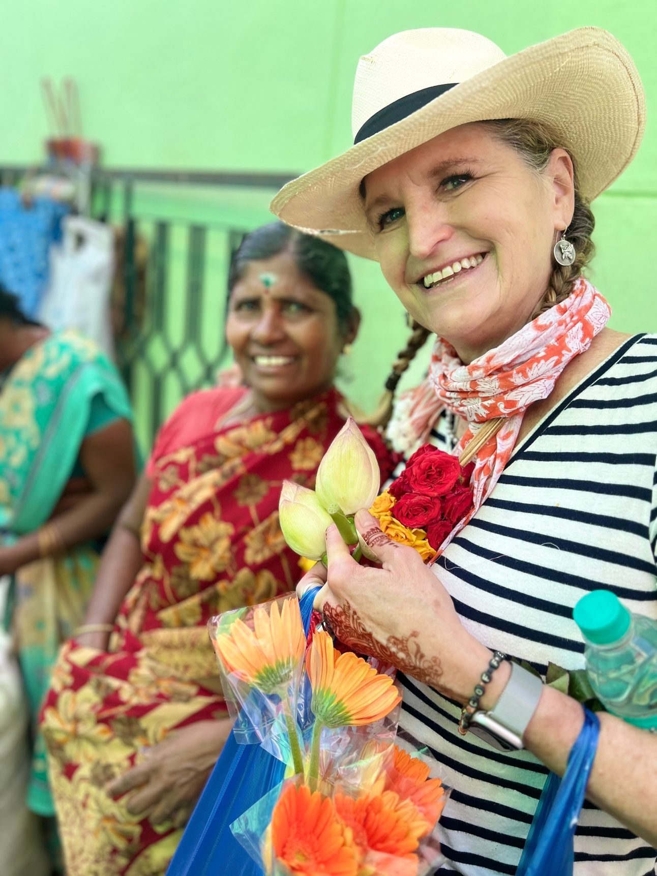 There’s nothing like getting to know great women while we get to know an exotic country together; we shriek with joy at the vibrant colors in a flower market in Madurai, dress each other in saris, compare notes on the loveliness of our ayurvedic massages, stretch and pose in yoga classes, egg each other on to approach cows by the side of the road, grab hands when our tuk tuks careen through traffic, help each other decide on purchases of everything from earrings to carpets.