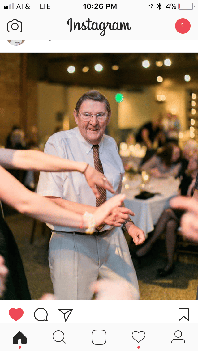 Oh did this photo touch a heart string for me. It’s my dad, age 87, dancing at the last family wedding he attended before his passing. He was the best dancer, the happiest one on the floor—right until the end. When they played “Shout” at my nephew’s reception—where this was taken—he couldn’t get as low as he used to during the “little bit softer now” section, but he sure tried.
