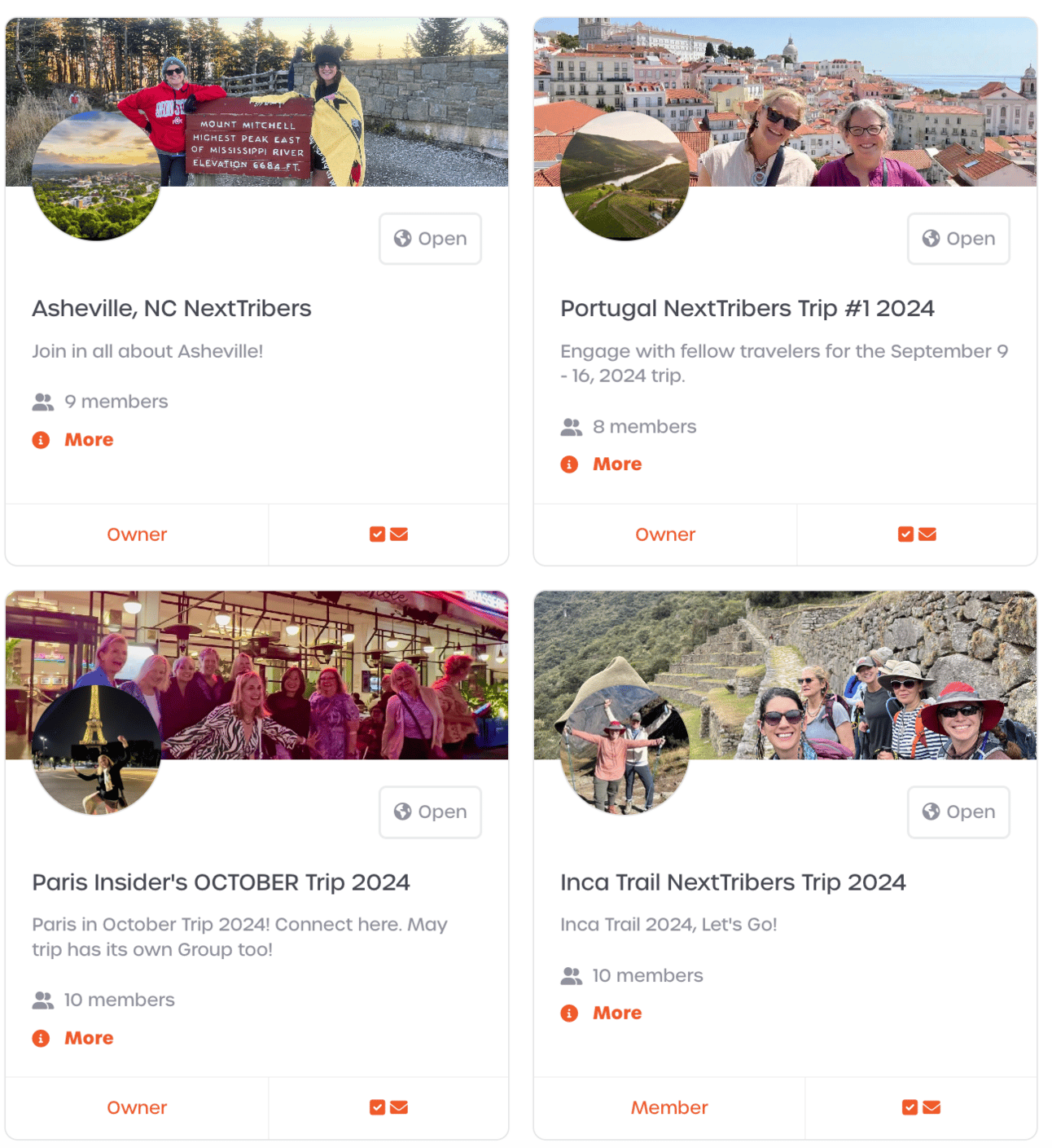 Click on GROUPS in the navigation and find the group or groups you want to join. Booked on a trip? There is a group for your destination too. Want to find NextTribers with your own interests? Create a GROUP yourself.