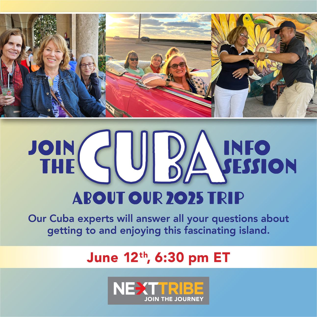 Cuba Info Session is Wednesday June 12th at 6:30 pm ET. Someone on that Zoom call will win a $400 discount on the trip just for showing up.