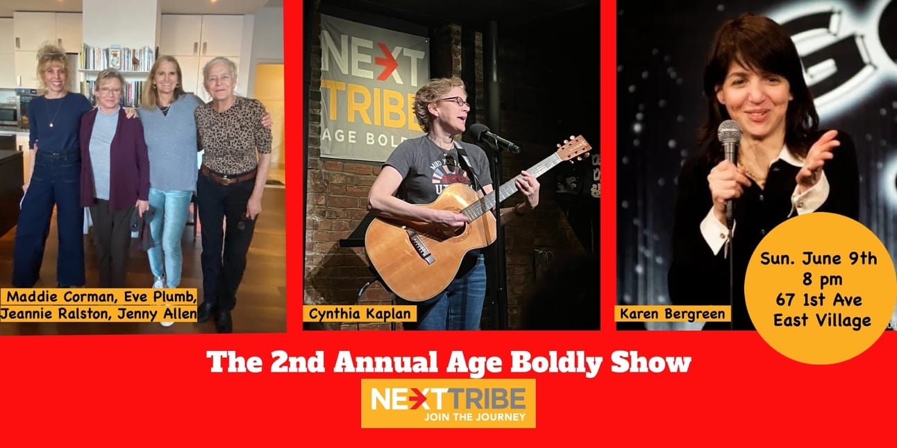 She’s also put together a second annual Age Boldly Show, Sunday, June 9th at 8PM. It features comedians and humorists and promises to exercise your laughing reflex.
