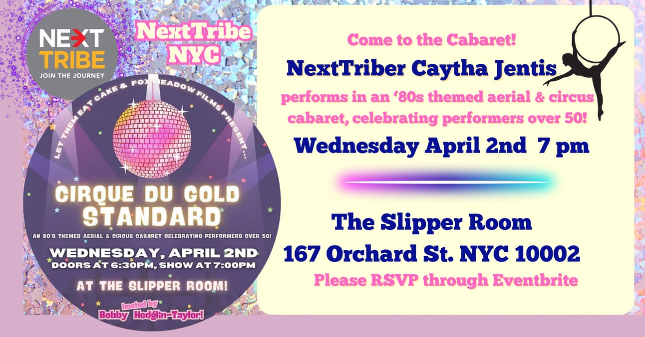 Caytha Jentis says, “Our next New York Next Tribe event will be going to the aerial/circus cabaret show that I'm performing in and co-producing Let Them Eat Cake, a monthly show at the Slipper Room.