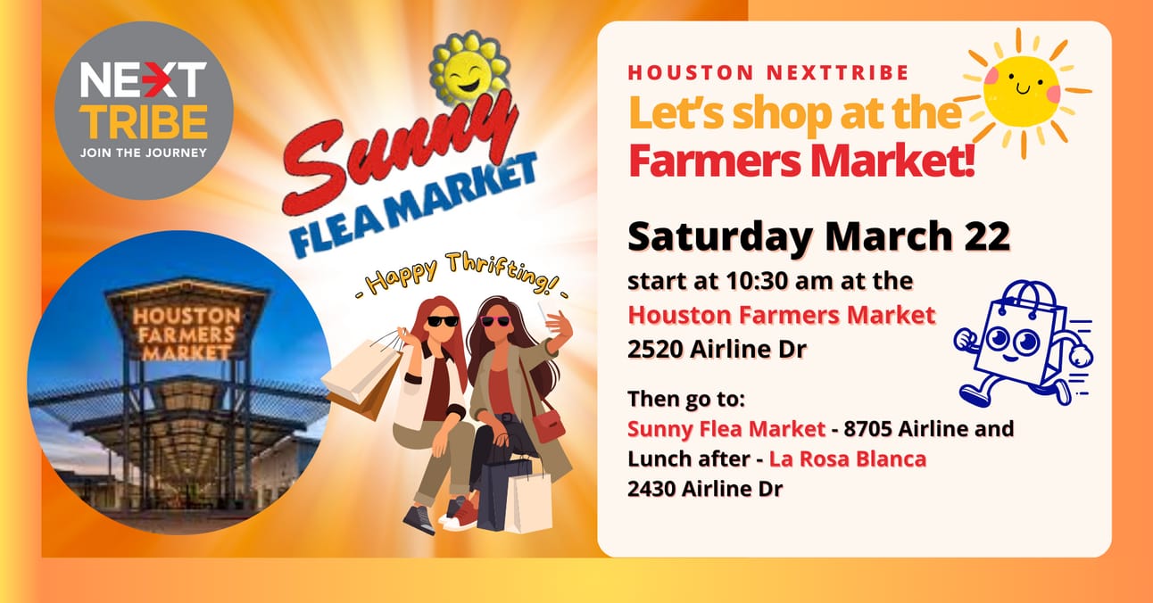 Katherine Adams has two great events coming up for the Houston NextTribe group! This weekend, Saturday, March 22, she’s asking everyone to meet up at the Houston Farmers Market, and then lunch afterward at La Rosa Blanca.