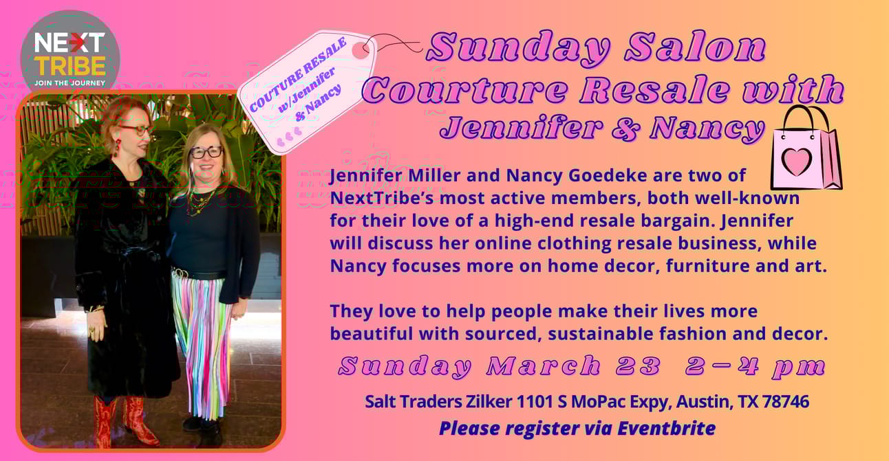This weekend’s Sunday Salon is sure to be stylish and special! Mark your calendar for Sunday, March 23rd. Nancy Goedeke and Jennifer Miller will present Couture Resale! We know these gals are both well-known for their love of a high-end resale bargain. They are going to share their secrets for buying and selling. Got a favorite thrifted outfit? Wear it and tell us your story!