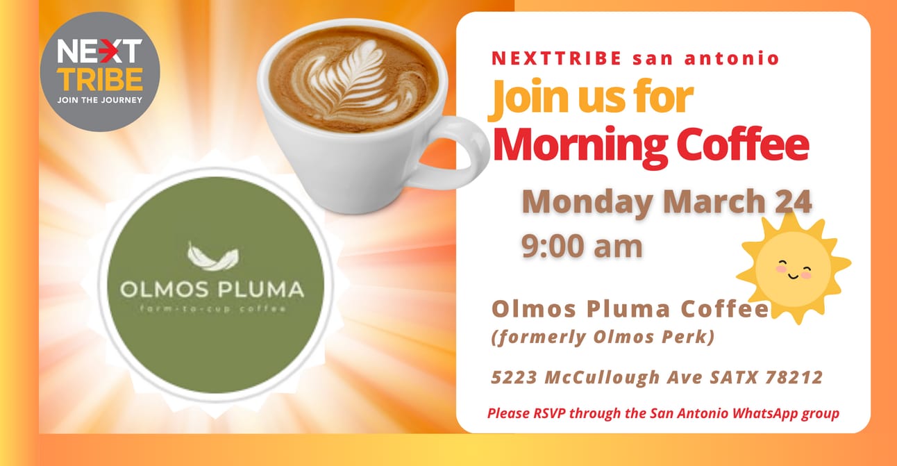 Lucie Frost is inviting all San Antonians to join her for Morning Coffee on Monday, March 24th, 9 a.m. Olmos Perk has been rebranded as Olmos Pluma on McCullough in the Olmos Park neighborhood. Please RSVP in the WhatsApp group.