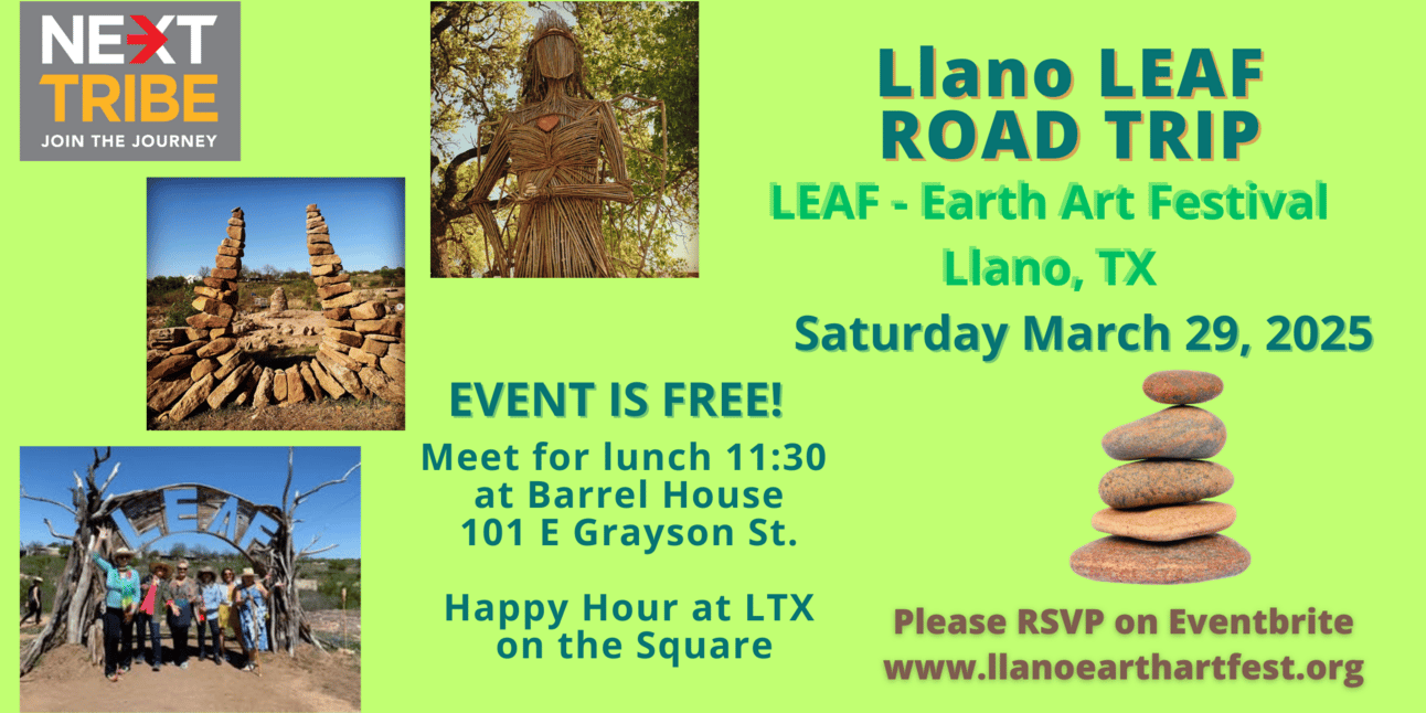 After being cancelled, we were delighted to see that one of our favorite Hill Country festivals is back on. Join your Austin NextTribe buds for a springtime road trip out to Llano on Saturday, March 29th. Two years ago we visited the Llano Earth Arts Festival, aka LEAF, led by local Jeannie Edmunds. No charge for the event, but we’d love to know if you’re coming. Please RSVP via Eventbrite.
