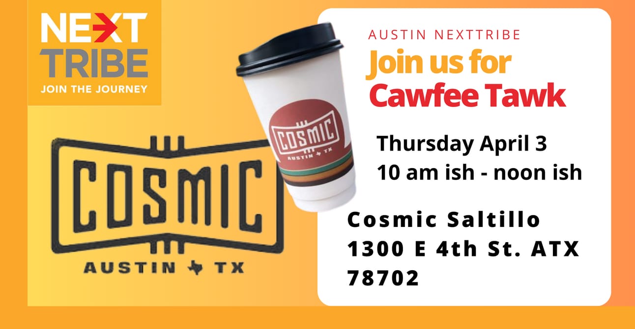 Cawfee Tawk this Thursday, April 3rd! I’m going to catch the red line train and meet y’all at Cosmic Cafe at Saltillo Plaza. ☕ Come join me, Austinites!