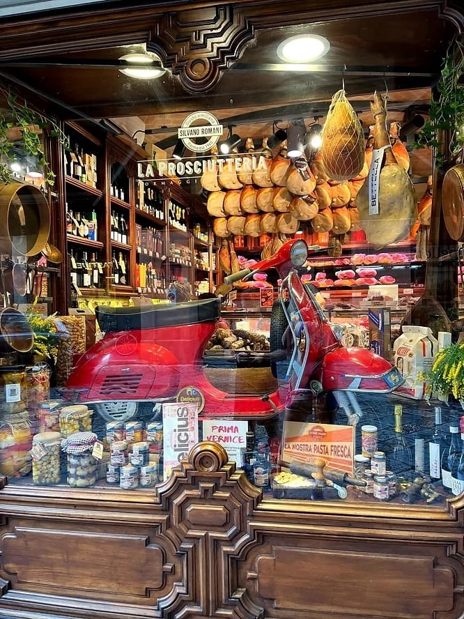 Prosciutto, parmigiana, and a side of scooter for sale (or for attention) in a Parma food shop.