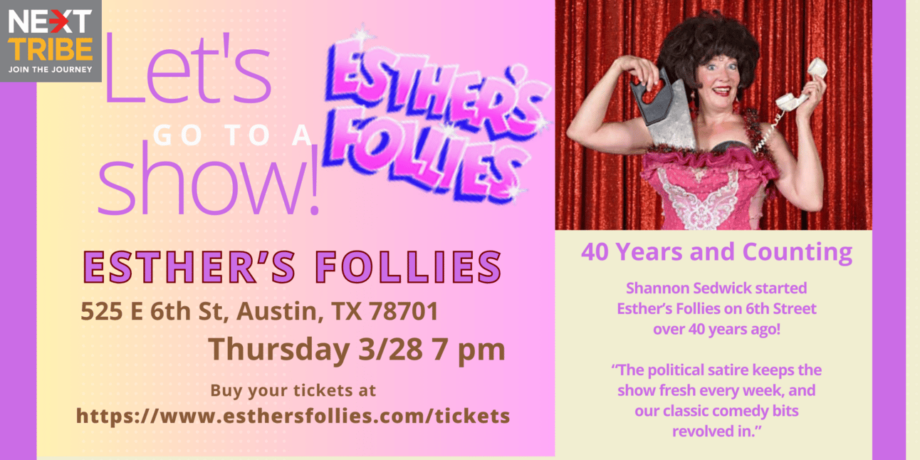 THURSDAY MARCH 28! Let’s "Be A Tourist In Your Own Town" and venture down to Dirty 6th! Esther's Follies is an INSTITUTION on 6th Street. Politically incorrect, topical and very, very funny. Not sure there are any tickets left to buy, but you can check on their website, www.esthersfollies.com/tickets