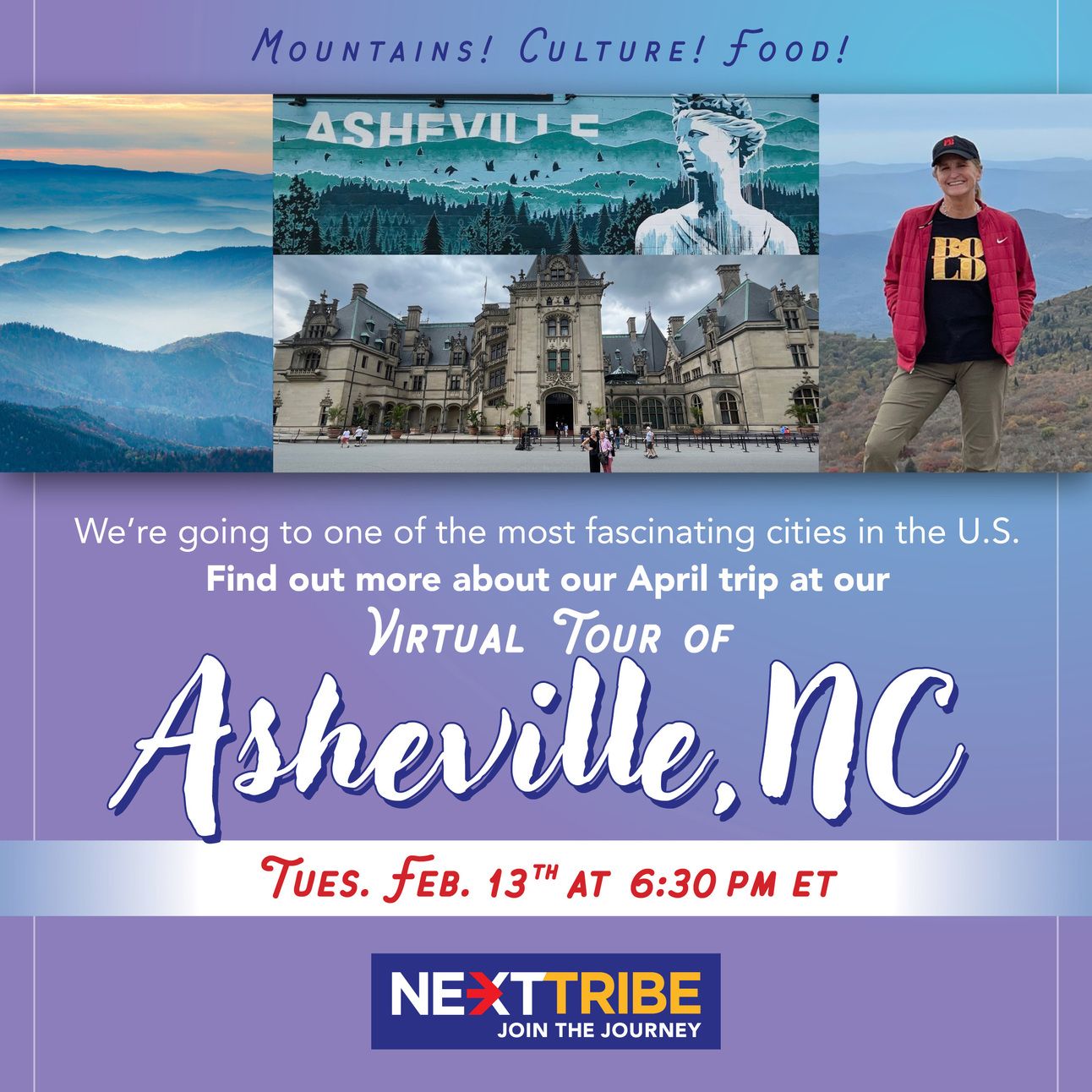 This is the first year we’re doing a trip to Asheville, and we’re lucky Jeannie will be there to show everybody around. Since she moved in, she’s made friends with local artists, entertainers, and entrepreneurs, and nobody’s surprised that she’s already setting up a local NextTribe group in her newly adopted hometown!