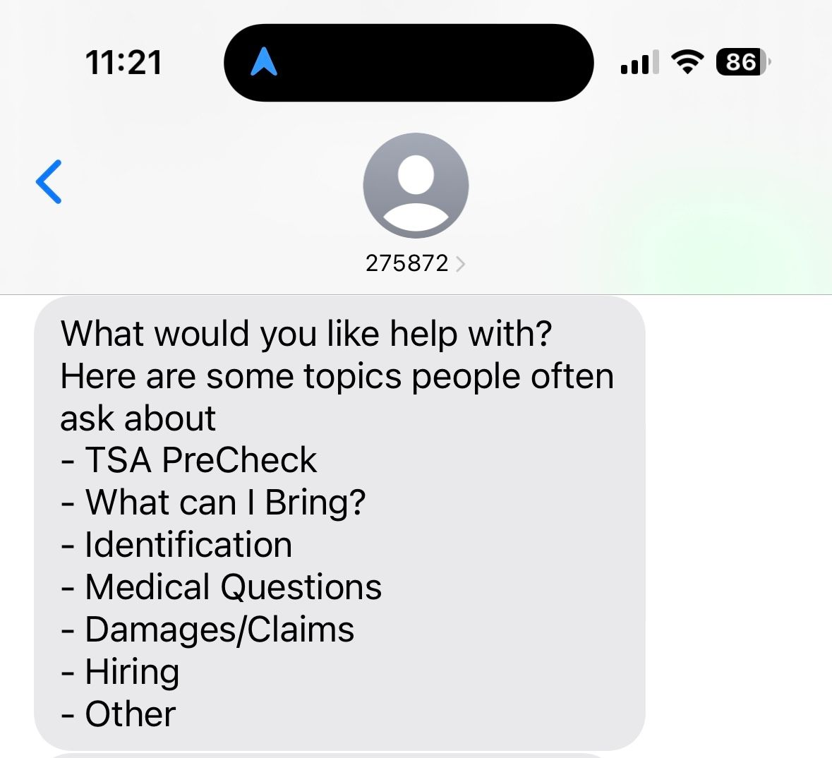 Most of us may still have to take off our shoes, but TSA is making small advances these days. TSA is now responding to texts. Text the number and in the message box write TSA.